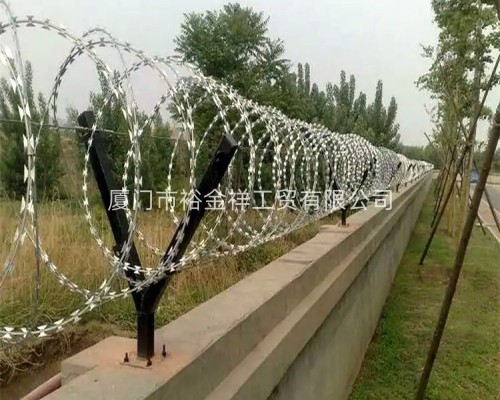 刀片刺網(wǎng)由熱鍍鋅鋼板或不銹鋼薄板沖壓出尖銳的刀片狀,高張力鍍鋅鋼絲或刀片刺繩者不銹鋼絲做芯線組合而成的阻絕器材。由于刺網(wǎng)造形獨(dú)特不易觸摸,因而能達(dá)到很好的防護(hù)隔離效果。