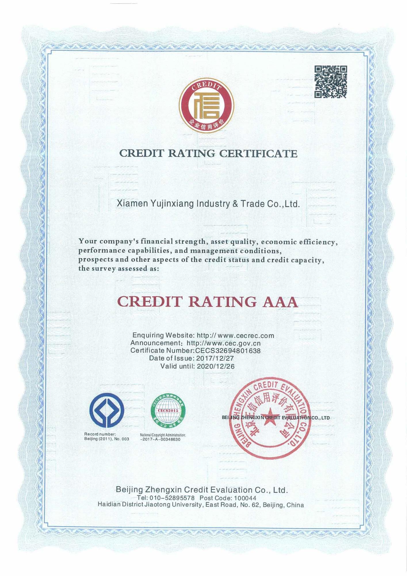 信用等級(jí)證書-AAA(英文)