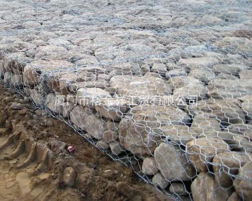 雷諾護墊也叫石籠護墊,格賓護墊,是指由機編雙絞合六邊形金屬網(wǎng)面構成的厚度遠小于長度和寬度的墊形工程構件。雷諾護墊中裝入塊石等填充料后連接成一體,成為主要用于水利堤防、岸坡、海漫等的防沖刷結構,具有柔性、對地基適應性的優(yōu)點。