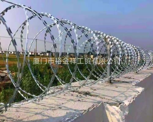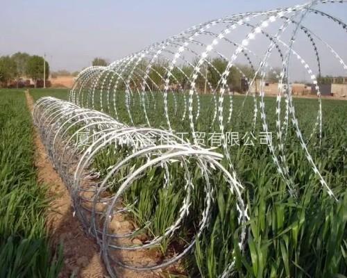 刀片刺網(wǎng)由熱鍍鋅鋼板或不銹鋼薄板沖壓出尖銳的刀片狀,高張力鍍鋅鋼絲或刀片刺繩者不銹鋼絲做芯線組合而成的阻絕器材。由于刺網(wǎng)造形獨(dú)特不易觸摸,因而能達(dá)到很好的防護(hù)隔離效果。